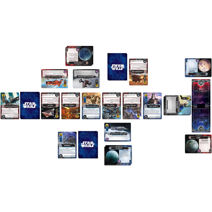 Un jeu compétitif pour deux joueurs vous plongeant dans la guerre que se livrent la République Galactique et l’Alliance Séparatiste. Votre adversaire et vous choisissez chacun le camp que vous souhaitez incarner : la République ou les Séparatistes. Au cours de la partie, vous améliorerez votre deck de départ en achetant des cartes qui renforceront votre puissance de feu et multiplieront vos ressources. Vous pourrez alors attaquer avec de plus en plus d’efficacité les bases de votre adversaire : le premier joueur qui détruit trois bases adverses remporte la partie !