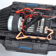 Le récepteur radio et le variateur waterproof autorisent une utilisation sous projections d’eau ou de neige* tandis que la carrosserie en polycarbonate, peinte et décorée, reprend le style des véhicules de rally-raid.