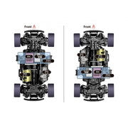 Six configurations possibles au total : Trois possibilités d’empattement : 209mm (S) / 224mm (M) / 239mm (L) avec roues motrices avant ou arrière. Il suffit simplement de changer le sens de fixation des pignons finaux et des biellettes de direction pour permuter entre Traction et Propulsion. Position basse ou haute du moteur au choix pour la configuration Propulsion.