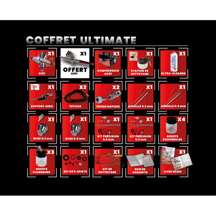 - 1 bon de garantie de 3 ans pour les aérographes et le compresseur