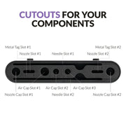 EMPLACEMENTS PERSONNALISABLES : La boîte de rangement comporte des fentes rondes avec mousse EVA amovible, vous permettant d'installer et de sécuriser facilement la plupart des buses d'aérographe et des capuchons d'air, garantissant un ajustement parfait pour vos composants.