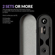 CONTENU POUR 2 JEUX OU PLUS : Grâce à ses découpes polyvalentes en mousse EVA, cette boîte peut accueillir jusqu'à deux jeux de buses, d'aiguilles et autres accessoires d'aérographe. Voici ce qu'elle peut contenir :